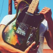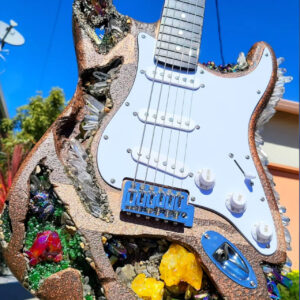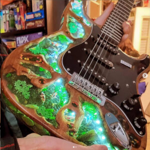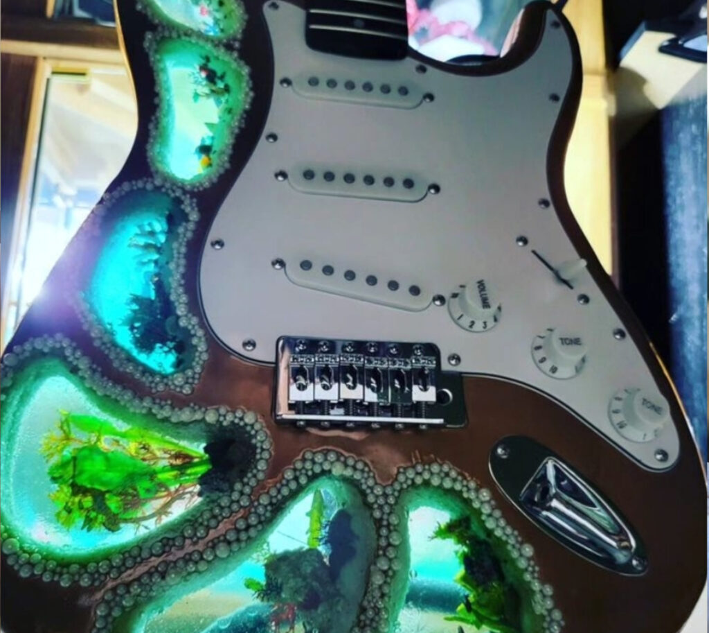 I also create custom theme guitars featuring a realistic stone look with crystal inlays, layered epoxy designs,